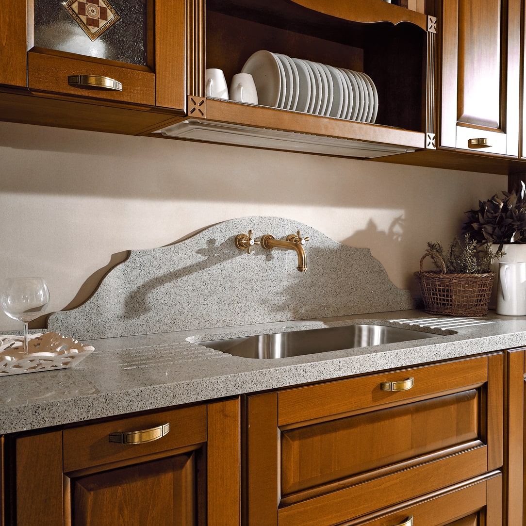 The sense of strength and the search of the detail are expressed by wooden worktops, the molten glass with a decorative shield in rilief and gold decorations, the three alternatives handles.